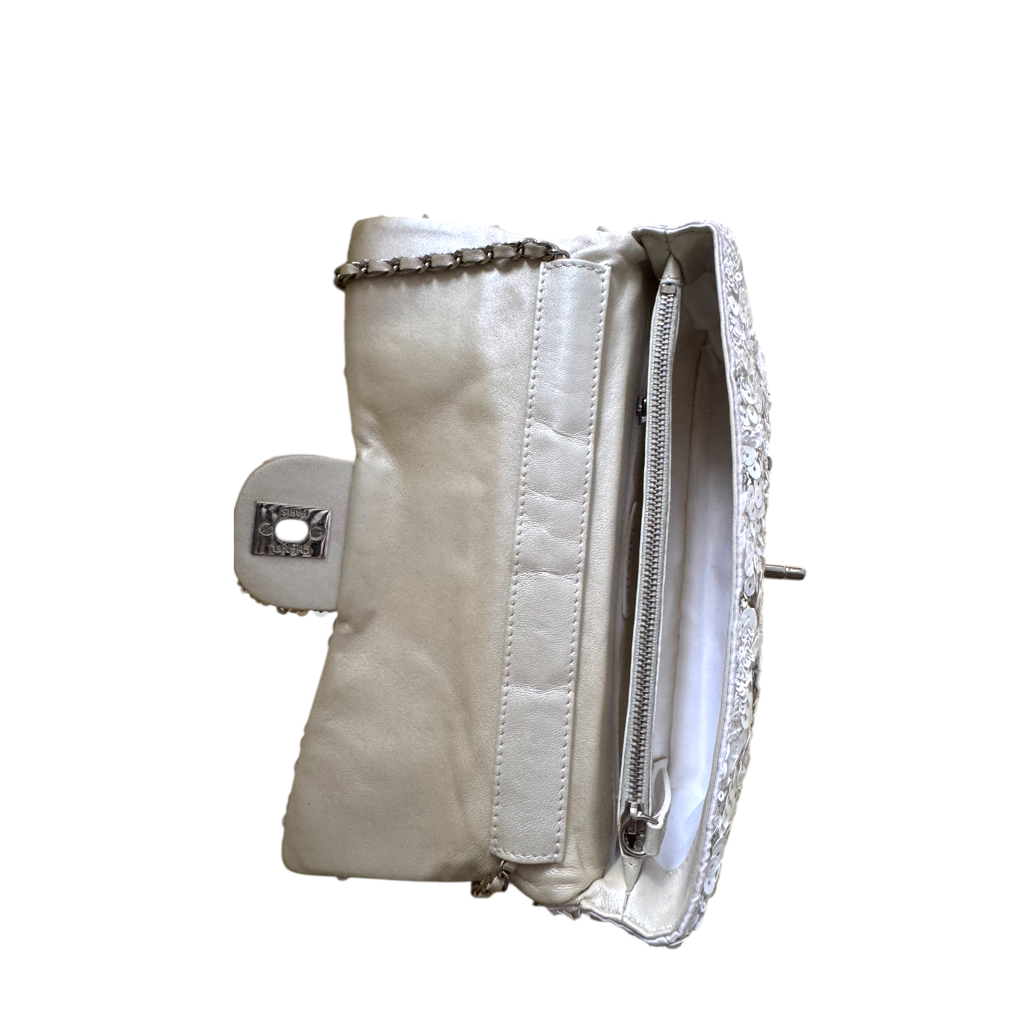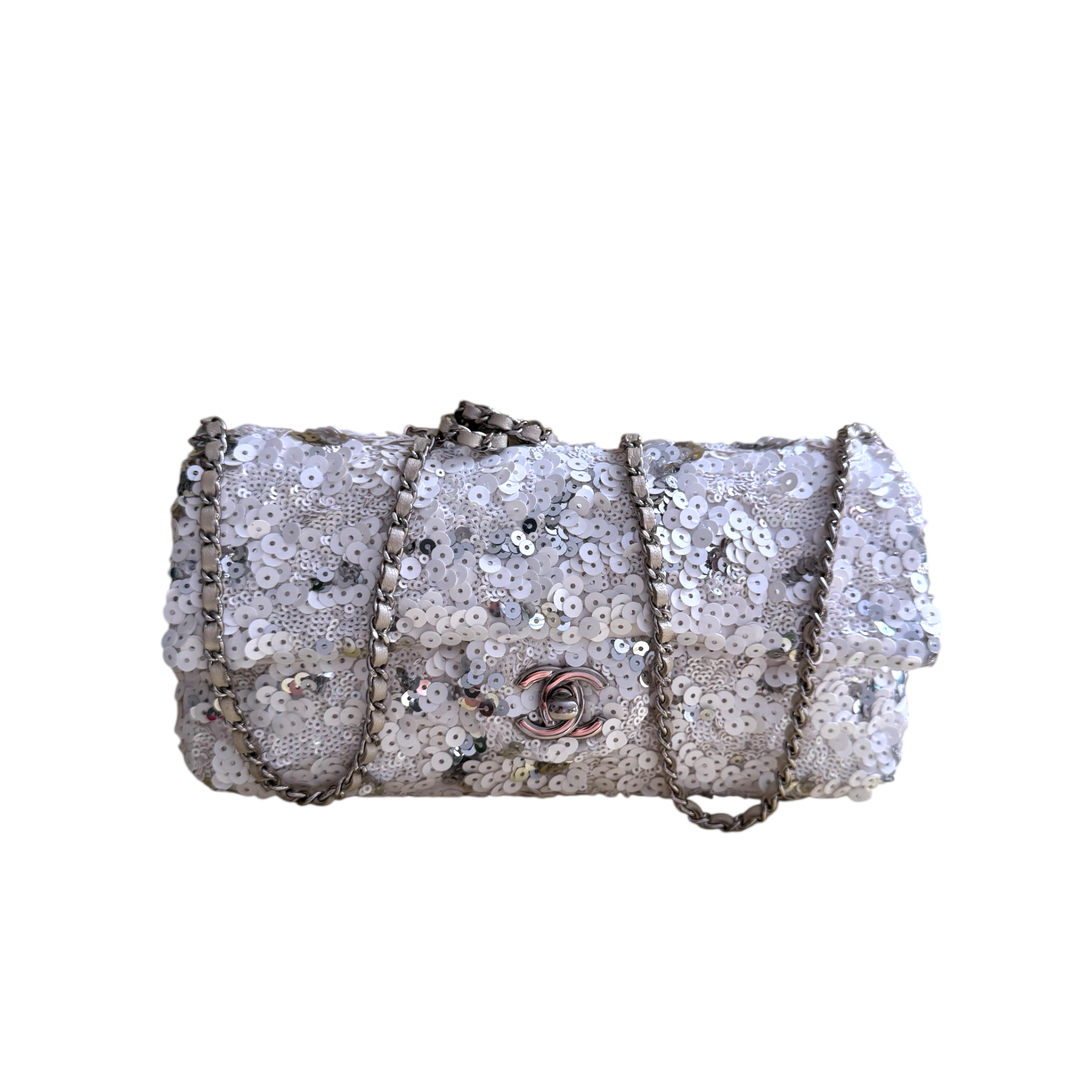 Material: White and silver sequin exterior with leather-threaded silver chain shoulder strap, silver-tone CC turn-lock closure, and satin interior with zipper pocket